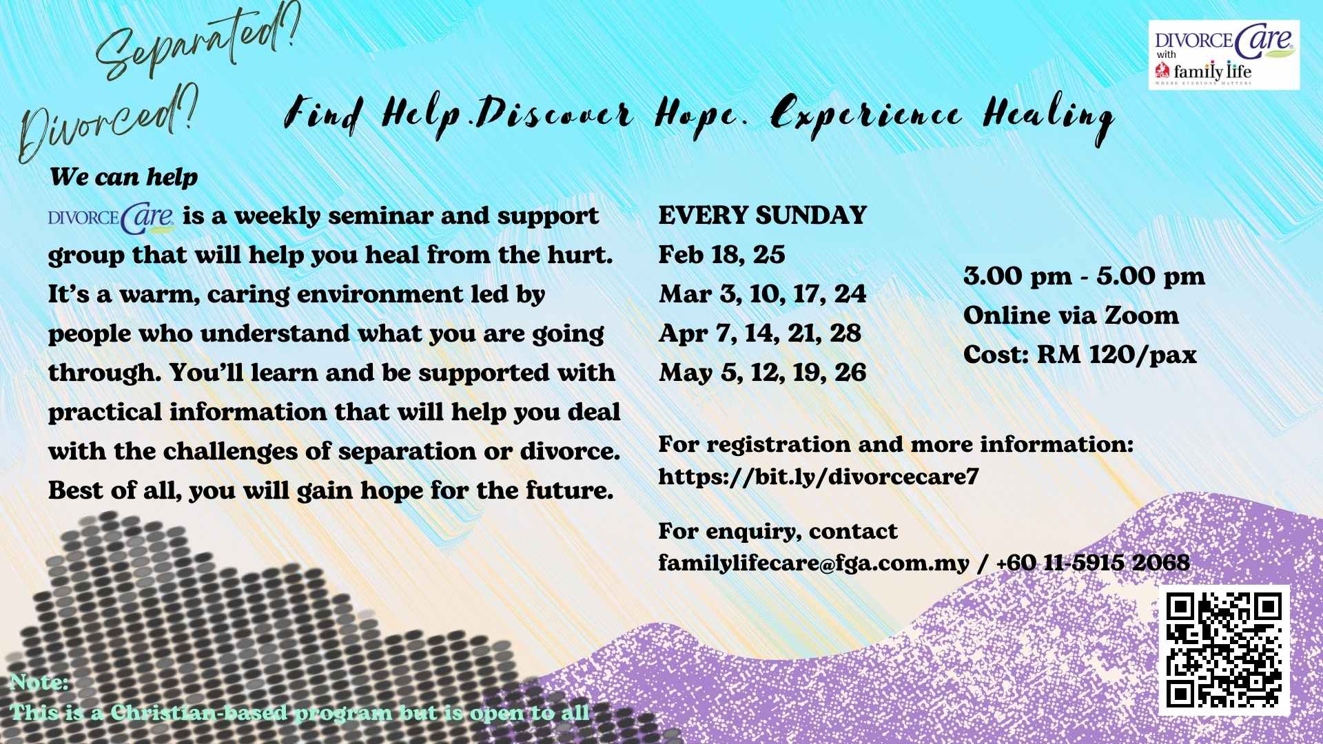 DivorceCare is a weekly seminar and support group that will help you heal from the hurt. It’s a warm, caring environment led by people who understand what you are going through. You’ll learn and be supported with practical information that will help you deal with the challenges of separation or divorce. Best of all, you will gain hope for the future.